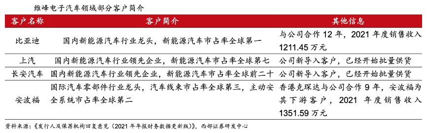 經(jīng)典案例:根據(jù)《發(fā)行人及保薦機構回復意見(2021年年報財務數(shù)據(jù)更新版)》、西部證券研發(fā)中心等綜合資訊表明,維峰電子公司依靠 K300、SDC、74040 等在性能方面已達到或接近國際一流廠商同等技術水 平的產(chǎn)品,較早進入了比亞迪的直供體系并形成先發(fā)優(yōu)勢,產(chǎn)品廣泛運用于漢、唐、秦、 宋及海洋系列以及大巴 K8、K9 系列。與此同時,公司通過與比亞迪合作,逐步形成品牌 效應,持續(xù)導入上汽、長安等新客戶。