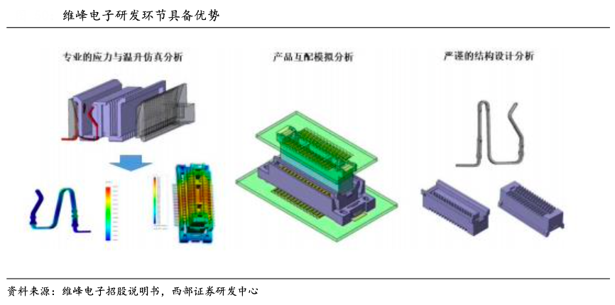 經(jīng)典案例:根據(jù)維峰電子招股說明書、西部證券研發(fā)中心等綜合資訊表明,在產(chǎn)品設計階段,維峰電子公司較早建立電子連接器技術研發(fā)中心,引進國內外先進的連接器 CAE 仿真設計軟件及 3D 模流分析軟件, 有效縮短新產(chǎn)品開發(fā)周期和客戶需求響應時間。
