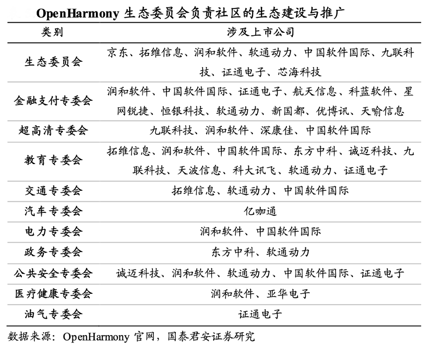 經(jīng)典案例:根據(jù)OpenHarmony官網(wǎng)、國泰君安證券研究等綜合資訊表明,OpenHarmony 生態(tài)委員會負責 OpenHarmony 開源生態(tài)建設(shè)與推廣, 目前委員單位包括華為、京東、開鴻智谷(拓維信息)、潤和軟件、軟通動力、深開鴻(中國軟件國際)、九聯(lián)科技、證通電子、芯??萍季偶摇I鷳B(tài)委員會下設(shè)金融支付、超高清、教育、交通、汽車、電力、政 務、公共安全、游戲、醫(yī)療健康、油氣等產(chǎn)業(yè)專委會,由各產(chǎn)業(yè)鏈主管 單位、設(shè)備廠商、應用廠商、客戶等構(gòu)成,其中涉及到的上市公司統(tǒng)計如下: