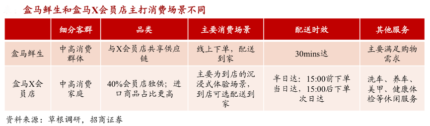 經(jīng)典案例:根據(jù)草根調(diào)研、招商證券等綜合資訊表明,目前盒馬鮮生的線上化率達(dá)60%以上,更多是強(qiáng)調(diào)到家,消費(fèi)者下單能夠享受即時配送。X會員店為消費(fèi)者提供一個到店的沉浸式的體驗場景,以“逛”的體驗為主,結(jié)合購買家庭所需生鮮、烘焙、零食等同時享受其他休閑服務(wù),感受更有溫度的購物體驗。