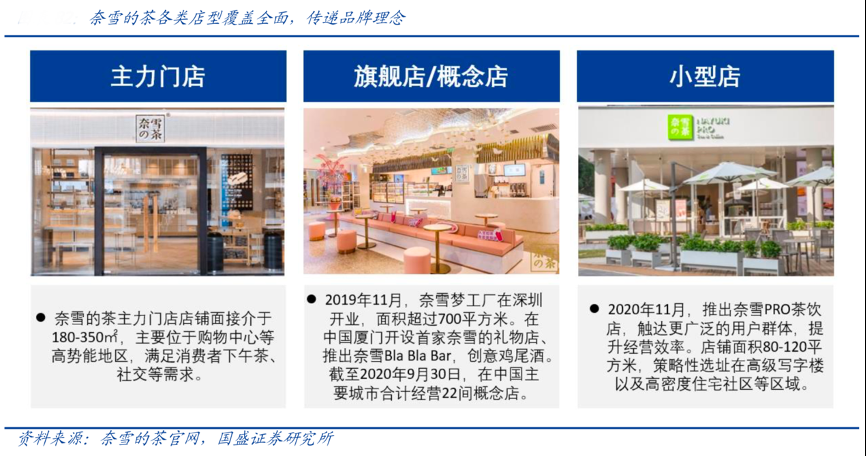 經(jīng)典案例:根據(jù)奈雪的茶官網(wǎng)、國盛證券研究所等綜合資訊表明,奈雪旗艦店包括奈雪夢(mèng)工廠、奈雪的禮物店以及奈雪 Bla Bla Bar,向消費(fèi)者傳遞多元化體驗(yàn)。1)2019 年 11 月,奈雪夢(mèng)工廠在深圳開業(yè),打造多場景大型體驗(yàn)茶飲店,面積 超過 700 平方米。2)2019 年公司在中國廈門開設(shè)首家奈雪的禮物店,將城市獨(dú)有的文 化融入空間,重金打造具有城市風(fēng)格的禮物店。3)奈雪 Bla Bla Bar 菜單包含一系列創(chuàng) 意雞尾酒,實(shí)現(xiàn)社交場景的“1+1”。白天在奈雪享受一杯好茶,一口軟歐包帶來的美好 生活,晚上在奈雪 Bar 享受夜生活。截至 2020 年,在中國主要城市合計(jì)經(jīng)營 20 間奈雪 Bla Bla Bar。