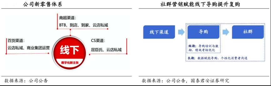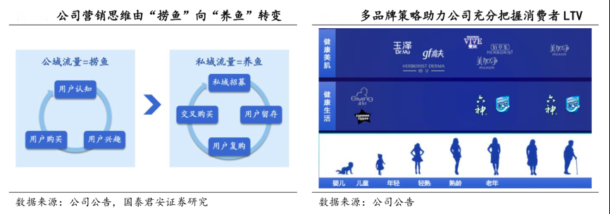 經(jīng)典案例:根據(jù)公司公告、國泰君安證券研究等綜合資訊表明,2021年,上海家化公司將以消費者為中心搭建一站式私域生態(tài),從招募、留存、復(fù)購到交叉購買環(huán)節(jié)牢牢把握消費者 LTV:1)私域招募,線上線下多觸點招募用戶進(jìn)入私域陣地;2)用戶留存,將各私域平臺數(shù)據(jù)整合進(jìn)公司消費者數(shù)據(jù)中臺,通過建模、標(biāo)簽化激活數(shù)據(jù)資產(chǎn),為消費者提供個性化推薦和購買福利;3)用戶復(fù)購,在千余個線下專柜推行社群營銷,通過專業(yè)導(dǎo)購實現(xiàn)消費者溝通與場景激活;4)跨品牌交叉購買,發(fā)揮公司品牌矩陣橫跨三大品類而互不競爭的優(yōu)勢,通過數(shù)據(jù)中臺分析各品牌消費者共性,以精準(zhǔn)營銷促進(jìn)用戶跨品牌購買,從而降低單品牌獲客成本、提升單用戶 LTV。