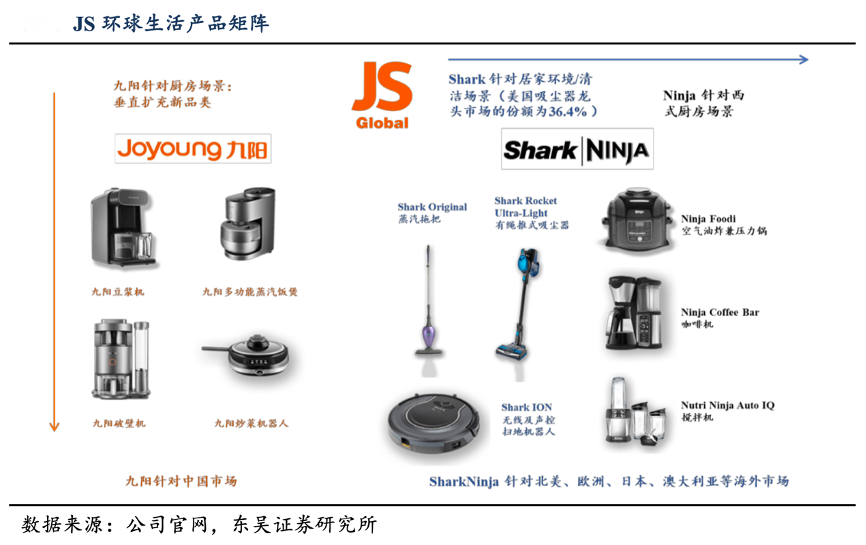 經(jīng)典案例:根據(jù)公司官網(wǎng)、東吳證券研究所等綜合資訊表明,九陽(yáng)公司在產(chǎn)品拓展分為縱向和橫向擴(kuò)展兩個(gè)方向。縱向是九陽(yáng)引導(dǎo)的廚房小家電場(chǎng)景的垂直拓展,在豆?jié){機(jī)后不斷開(kāi)拓新品類(lèi)成為公司新的增長(zhǎng)引擎;橫向指通過(guò)收購(gòu) SharkNinja 開(kāi)拓出居家環(huán)境場(chǎng)景和西式廚電場(chǎng)景。其集團(tuán)整體的產(chǎn)品矩陣得以完善,在實(shí)現(xiàn)多品牌運(yùn)營(yíng)的同時(shí),走上小家電出海之路。