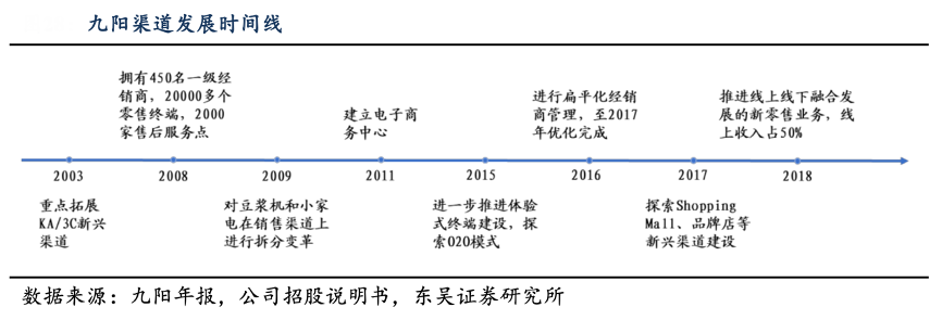 經(jīng)典案例:根據(jù)公司官網(wǎng)、公司招股說(shuō)明書(shū)、東吳證券研究所等綜合資訊表明,九陽(yáng)公司早在 2011 年成立電子商務(wù)中心,2018年時(shí)九陽(yáng)已經(jīng)打造了線上直銷(xiāo)系統(tǒng)(包括天貓旗艦店,以及微信“九陽(yáng)商城”),并且分銷(xiāo)網(wǎng)絡(luò)覆蓋了幾乎所有主要的電商平臺(tái)(包括三大電商平臺(tái)淘寶,京東和蘇寧易購(gòu))。截止 2018 年中三大電商平臺(tái)的日均流量達(dá)到了 110 萬(wàn)人次并合計(jì)擁有訂閱人次超 1510 萬(wàn)用戶。