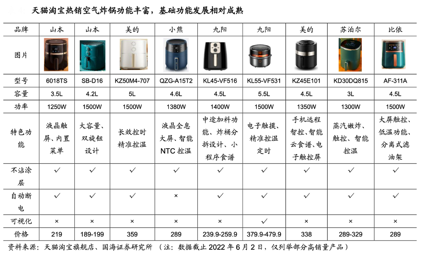經(jīng)典案例:根據(jù)天貓?zhí)詫毱炫灥?、國海證券研究所等綜合資訊表明,空氣炸鍋從傳統(tǒng)的旋鈕機械款升 級到電子液晶屏,目前均勻加熱等技術基本已經(jīng)落地。為提升設備可操作性,產(chǎn)品設計和材料選擇上也更加人性化科技化,如自動斷電、食品級不沾涂層、大屏觸控的使用提升了使用安全性、精度和使用體驗。