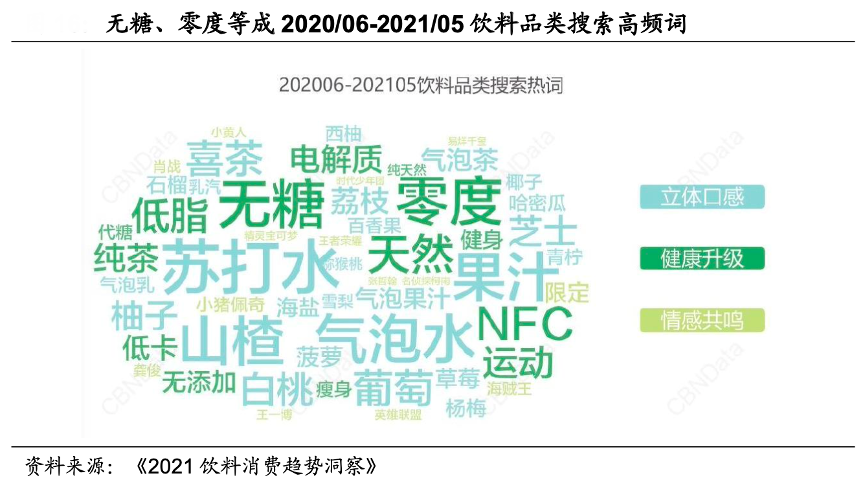 經(jīng)典案例:根據(jù)《2021飲料消費趨勢洞察》、國海證券研究所等綜合資訊表明,眾多品牌推出無糖飲品,2005年可口可樂零度產(chǎn)品引領無糖無熱量風向,2018年元氣森林推出 0 糖 0 脂肪 0 卡路里蘇打氣泡水迅速搶占市場,2020 年喜茶、奈雪的茶推出無糖氣泡水進軍無糖市場。結合《2021飲料消費趨勢洞察》顯示,“立體口感、健康升級、情感共鳴”成為飲料市場三大新消費趨勢,無糖、零度等成為飲料品類搜索高頻詞,無糖產(chǎn)品備受消費者青睞。