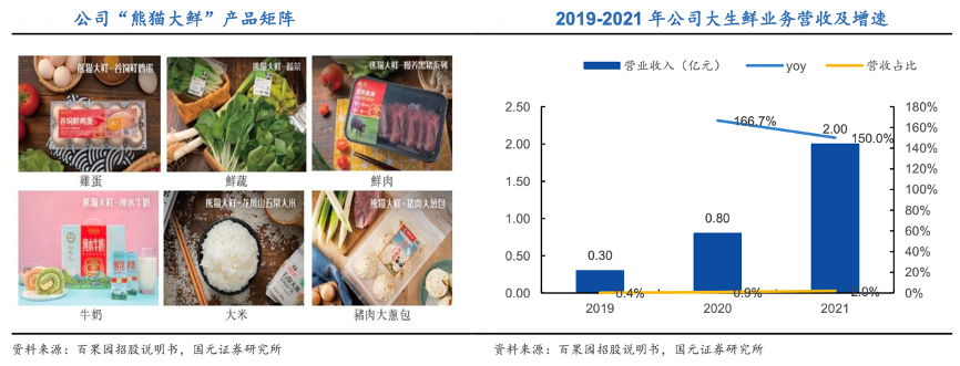 經(jīng)典案例:根據(jù)百果園招股說明書、國元證券研究所等綜合資訊說明,百果園公司近年來橫向拓展 SKU,將水果零售的成功經(jīng)驗復(fù)制至“大生鮮”板塊。2020年底公司推出生鮮自有品牌“熊貓大鮮”,主要分銷包括非標(biāo)品的產(chǎn)品蔬菜、鮮肉、海鮮等,以及預(yù)包裝的標(biāo)品如糧油、乳制品等,截至 202 1 年底品牌業(yè)務(wù)覆蓋超 100 種大生鮮品類。2021年公司大生鮮業(yè)務(wù)營收為 2 億元,同比增長 150.0%,占產(chǎn)品銷售總收入比重由 2019 年的 0.4%提升至2.0%。