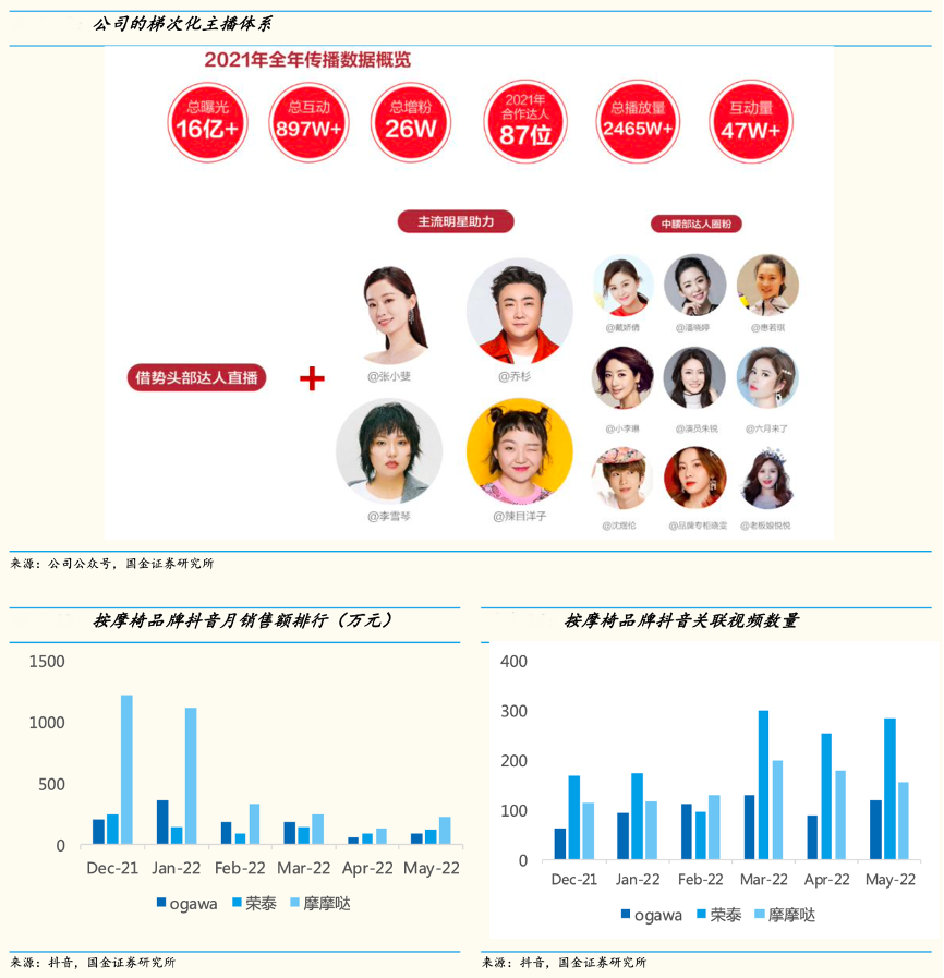 經(jīng)典案例:根據(jù)公司公眾號(hào)、抖音、國(guó)金證券研究所等綜合資訊表明,2021年雙 11 榮泰實(shí)現(xiàn)全網(wǎng)成交額 2.25 億元(位居第一),按摩椅總銷量34000+臺(tái),品牌全網(wǎng)總曝光 11.2 億次。2021年公司抖音平臺(tái)自播銷售額行業(yè)第一,搭建公司的梯次化主播體系。