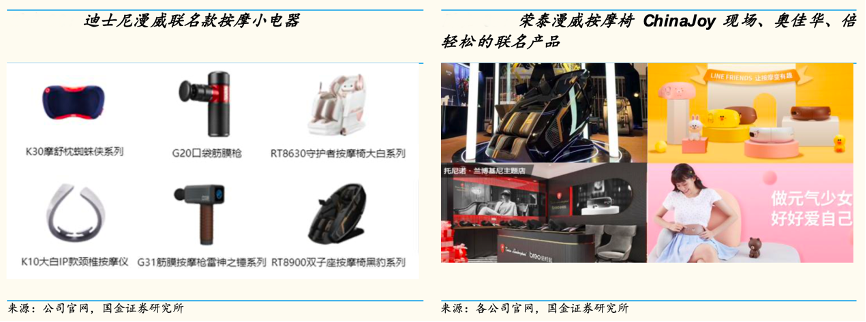 經(jīng)典案例:根據(jù)各公司官網(wǎng)、國(guó)金證券研究所等綜合資訊表明,榮泰健康公司2019年底與迪士尼合作,與其旗下知名 IP 超能陸戰(zhàn)隊(duì)、漫威系列聯(lián)名推出按摩椅 (RT8630 大白系列、RT8900 黑豹系列等)、按摩小電器如筋膜槍、頸部按摩 儀系列。公司2020年參加知名數(shù)字娛樂(lè)展會(huì) ChinaJoy,在一二線城市及省會(huì)主辦15+次主題展,直接觸達(dá)年輕消費(fèi)者群體。