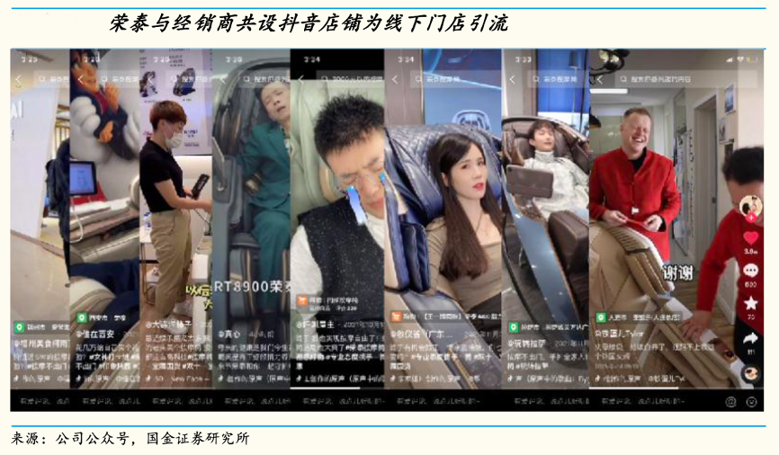 經(jīng)典案例:根據(jù)公司公眾號(hào)、國(guó)金證券研究所等綜合資訊表明,榮泰健康公司利用線上營(yíng)銷的優(yōu)勢(shì),線上進(jìn)一步為線下引流。其于2021年嘗試與經(jīng)銷商共設(shè)抖音店鋪,為線下門店引流;并通過(guò)抖音、視頻號(hào)等平臺(tái)的重點(diǎn)運(yùn)營(yíng),為線下完成視頻拍攝制作超 400 條,支撐門店、商場(chǎng)、展會(huì)等渠道的傳播。