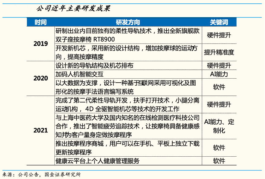 經(jīng)典案例:根據(jù)公司公告、國金證券研究所等綜合資訊表明,榮泰健康在硬件方面,2019年研制出業(yè)內(nèi)目前獨有的柔性導(dǎo)軌技術(shù),推出全新旗艦款雙子座按摩椅 RT8900,成為行業(yè)里程碑。其進一步優(yōu)化柔性導(dǎo)軌 技術(shù),在2021 年完成了第二代柔性導(dǎo)軌開發(fā),扶手打開技術(shù),小腿分離運動機構(gòu),4D全驅(qū)智能機芯等技術(shù)的開發(fā)工作。