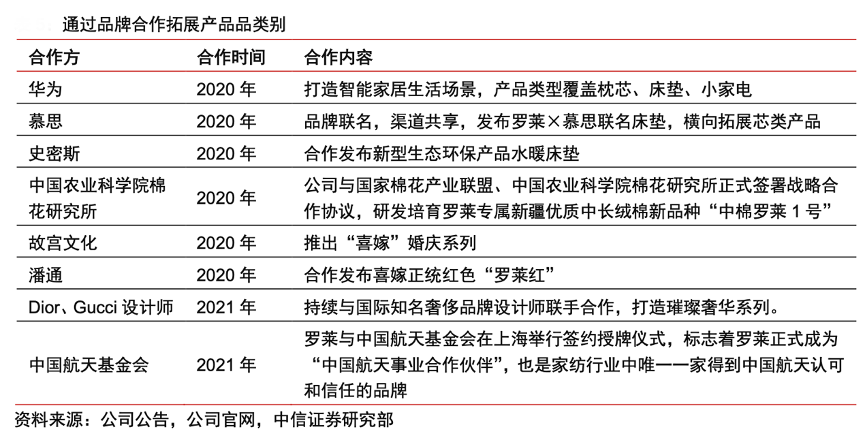 經(jīng)典案例:根據(jù)公司公告、公司官網(wǎng)、中信證券研究部等綜合資訊表明,2020 年起羅萊家紡加大與知名品牌的合作力度,拓展產(chǎn)品種類,增強(qiáng)品牌聲量。例如與華為 HiLink 開(kāi)啟合作,攜手打造智能生活場(chǎng)景下的 新智能產(chǎn)品系列,覆蓋枕芯、床墊、小家電等;與高端熱水器品牌史密斯合作發(fā)布新型生態(tài)環(huán)保產(chǎn)品 水暖床墊;與 Dior、Gucci 等國(guó)際知名奢侈品牌設(shè)計(jì)師聯(lián)手合作,打造璀璨奢華系列。