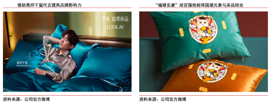 經(jīng)典案例:根據(jù)公司官方微博、中信證券研究部等綜合資訊表明,羅萊流量代言人結(jié)合國(guó)潮元素注入年輕活力。2020年 10 月,羅萊選擇易烊千璽為品牌形 象代言人,通過(guò)代言人的溫潤(rùn)氣質(zhì)傳遞品牌超柔定位,并有效提升品牌流量與拉新能力。羅萊·粹系列與故宮文化合作,將當(dāng)代年輕人喜愛(ài)的國(guó)潮元素融入床品設(shè)計(jì),在簡(jiǎn)約高雅的同時(shí)蘊(yùn)含吉祥寓意,為品牌注入年輕活力。