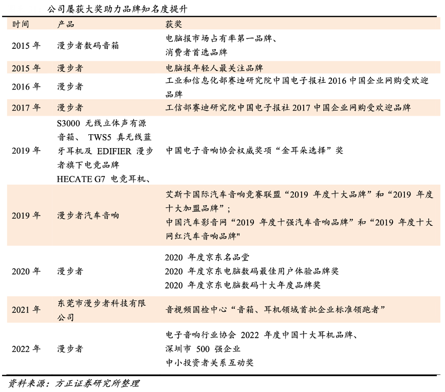 經(jīng)典案例:根據(jù)公司官網(wǎng)、方正證券研究所等綜合資訊表明,漫步者多次獲獎助力知名度提升,優(yōu)勢音頻產(chǎn)品突出。
