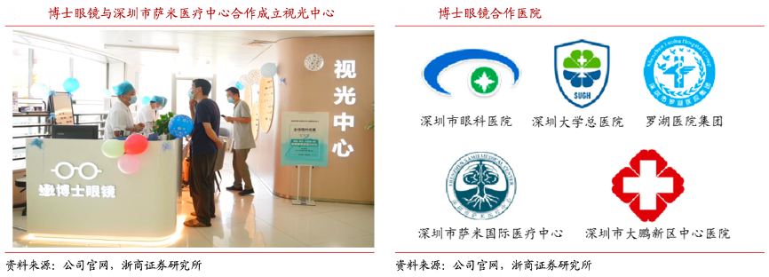 經(jīng)典案例:根據(jù)公司官網(wǎng)、浙商證券研究所等綜合資訊表明,博士眼鏡公司2020 年成立深圳市博士視覺健康科技有限公司,專注視覺健康及相關(guān)延伸服務(wù),在深圳同多家公立醫(yī)院眼科及社康中心合作,截至 2022 上半年共在院端合作設(shè)立了 9 家視光中心,為患者提供驗光配鏡、近視防控以及近視和斜弱視康復(fù)訓(xùn)練等專業(yè)化服務(wù),有助于提升公司專業(yè)化的品牌形象。