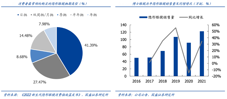 經典案例:根據公司公告、《2022新生代隱形眼鏡消費指南藍皮書》、國盛證券研究所等綜合資訊表明,隱形眼鏡具備美觀和易佩戴的特性,且“越短越健康”等理念深入人心,博士眼鏡公司短周期隱形眼鏡受到消費者青睞,促進隱形眼鏡系列產品銷量高增,2016-2021公司隱形眼鏡銷售量從 50.1 萬副增長至 122.6 萬副,營收從 7788 萬增長至 1.42 億元。