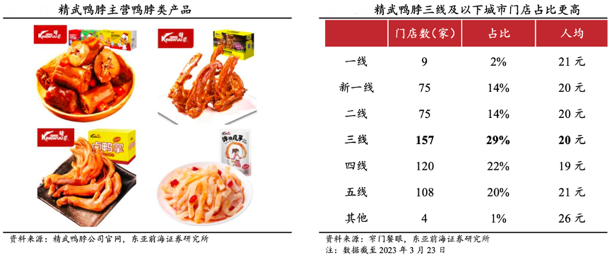 經(jīng)典案例:根據(jù)精武鴨脖公司官網(wǎng)、東亞前海證券研究所、窄門餐眼等綜合資訊表明,精武鴨脖成立于 1991 年,主要經(jīng)營(yíng)休閑鴨脖類產(chǎn)品,截至 2023 年 3 月 23 日,其在全國(guó)范圍內(nèi)已有 548 家門店,覆蓋了全國(guó) 30 個(gè)省份和 189 個(gè)城市。精武鴨脖 2002 年起專注鴨脖鹵制,在鴨脖領(lǐng)域處于領(lǐng)先地位,在三線及以下城市門店占比更高。