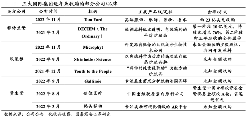 經(jīng)典案例:根據(jù)公司公告、化妝品觀察和國(guó)泰君安證券研究等綜合資訊表明,2022年各大國(guó)際美妝巨頭同樣面臨增長(zhǎng)放緩的壓力,投資并購(gòu)有所加速,重點(diǎn)案例包括雅詩(shī)蘭黛斥資約 23 億美元收購(gòu) Tom Ford;歐萊雅收購(gòu)小眾特色品 牌 Skinbetter Science、Youth to the People,同時(shí)投資從事原料研究的生 物技術(shù)公司 Microphyt。