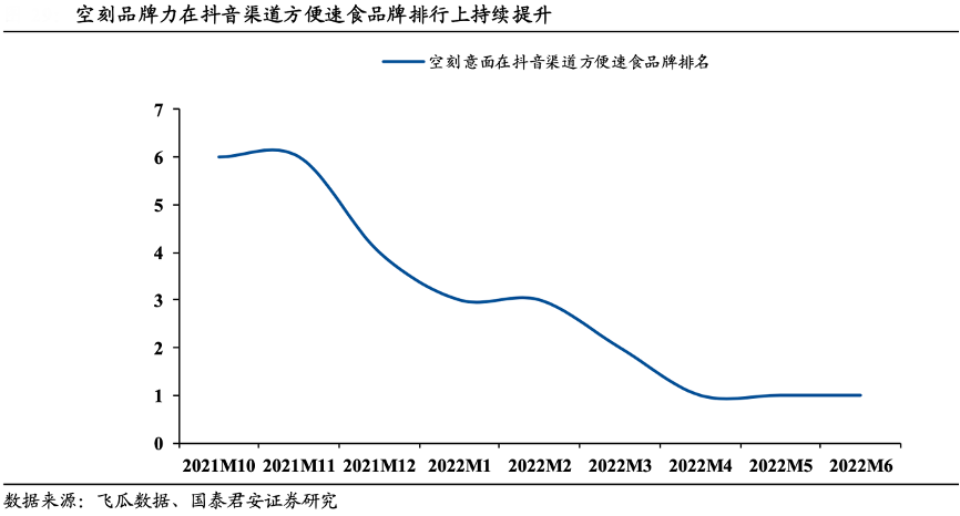 經(jīng)典案例:根據(jù)飛瓜數(shù)據(jù)、國泰君安證券研究等綜合資訊表明,空刻公司以“海陸空式”立體化投放(直播帶貨/KOL 種草/梯媒廣告/電視劇廣告植入等)進(jìn)行品牌宣傳,配合產(chǎn)品/渠道力的同步發(fā)力,其品牌影響力持續(xù)提升,從數(shù)據(jù)上看,空刻在抖音渠道方便速食品牌排行榜上從 2021 年 10 月的第 6 名持續(xù)進(jìn)步至 2022 年 3 月的第2 名,并從 2022 年 4 月開始穩(wěn)居第 1 名。