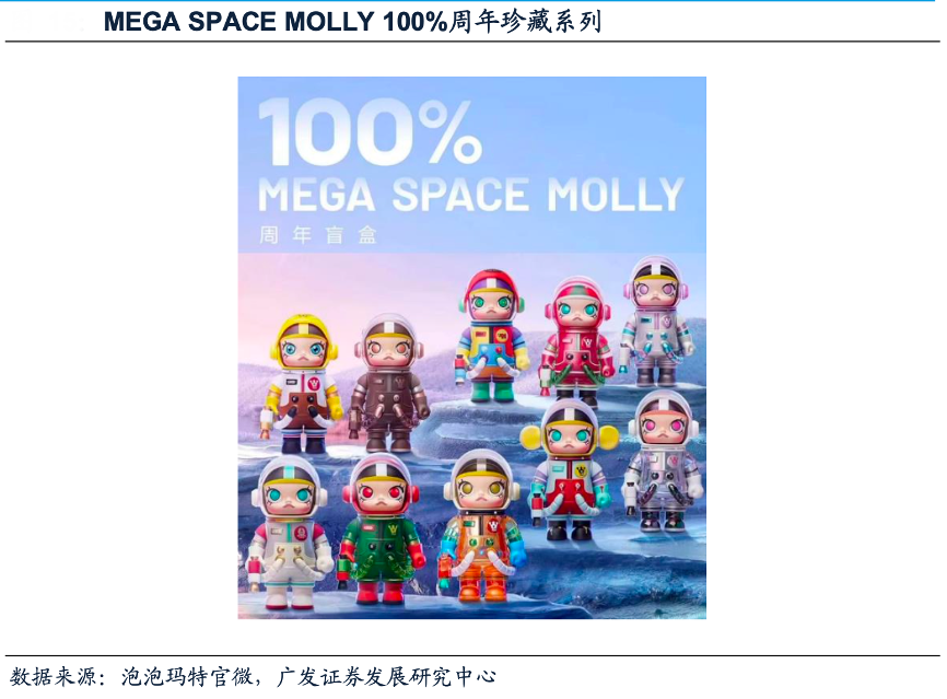 經(jīng)典案例:根據(jù)泡泡瑪特官微、廣發(fā)證券發(fā)展研究中心等綜合資訊表明,2022年8月泡泡瑪特創(chuàng)新性推出常規(guī)盲盒尺寸的MEGA系列——MEGA SPACE MOLLY 100%珍藏系列,該系列以MEGA推 出的1000%和400%尺寸的各款MEGA SPCAE MOLLY系列為原型,將其縮小為100% 尺寸,但保持了大尺寸MEGA可玩細節(jié)的一致(包括胳膊可活動、面罩可打開、攝影槍可拆卸等)。