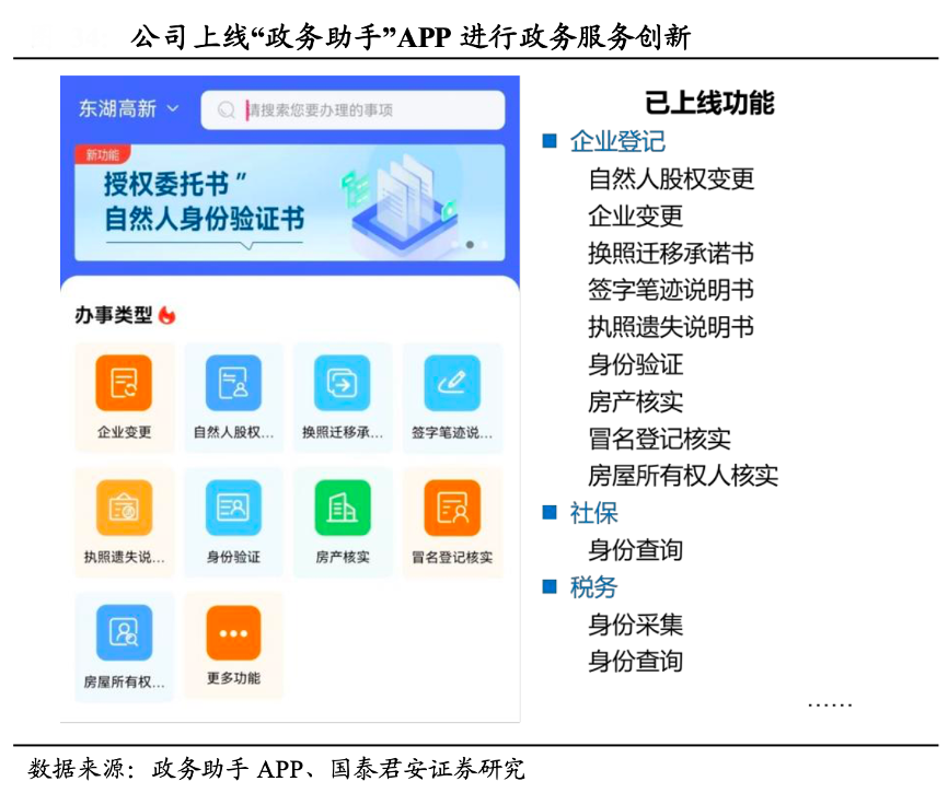 經(jīng)典案例:根據(jù)政務(wù)助手APP、國(guó)泰君安證券研究等綜合資訊表明,特發(fā)服務(wù)公司專注 “智 慧政務(wù)”,特發(fā)政務(wù)不斷推進(jìn)政務(wù)服務(wù)信息化建設(shè)。2017 年,公司承接了“智慧光谷 平臺(tái)”項(xiàng)目,該平臺(tái)全面集成行政辦公網(wǎng)上辦事,具備市民投訴、業(yè)務(wù)辦理、大數(shù)據(jù)分析等電子核心政務(wù)應(yīng)用功能。另外,以用戶需求為導(dǎo)向的 “政務(wù)助手”APP 也廣受好評(píng),截至 2022 年,APP 已上線運(yùn)行的商事登 記、房產(chǎn)核實(shí)、自然人股權(quán)轉(zhuǎn)讓、授權(quán)委托書等辦事功能,在武漢九個(gè) 城區(qū)已累計(jì)服務(wù)超百萬人次。