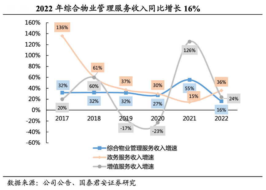 經(jīng)典案例:根據(jù)公司公告、國(guó)泰君安證券研究等綜合資訊表明,目前來看特發(fā)服務(wù)公司綜合物業(yè)管理服務(wù)收入平穩(wěn)增長(zhǎng),綜合物業(yè)管理服務(wù) 2022年?duì)I業(yè)收入同比上漲16%,而政務(wù)服務(wù)營(yíng)收 2022 增速較 2021 提升 21pct 至36%,從項(xiàng)目分布上看,公司目前業(yè)務(wù)已經(jīng)覆蓋五個(gè)省級(jí)單位,專業(yè)化、標(biāo)準(zhǔn)化、規(guī)?;臉I(yè)務(wù)布局逐步形成; 增值服務(wù)營(yíng)收波動(dòng)性大,2022 年?duì)I收增速 24%。