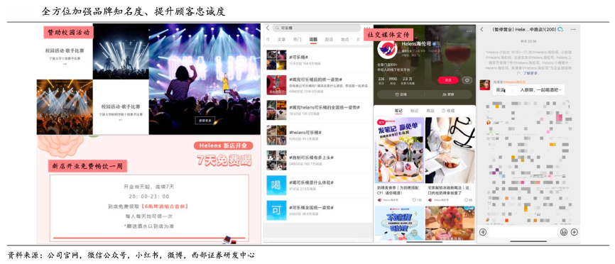 經(jīng)典案例:根據(jù)公司官網(wǎng)、微信公眾號、小紅書、微博、西部證券研發(fā)中心等綜合資訊表明,截至目前,海倫司已贊助過超 100 所高校的大型活動,利用社交媒體加強品牌知名度,如“喝完可樂桶后的同一姿勢”在微博話題閱讀量超 1300 萬次;同時通過豐富的活動與客戶實現(xiàn) 多元化互動,如每天選擇部分歌曲供客戶通過微信小程序投票,并播放得票最多的歌曲; 在顧客等位時贈送免費飲品,新店開業(yè)免費暢飲一周等。