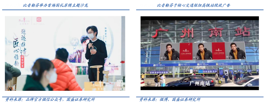 經(jīng)典案例:根據(jù)贏商大數(shù)據(jù)、wind、微信、品牌官方微信公眾號、微博、國盛證券研究所等綜合資訊表明,作為以高爾夫為品牌基因、以中高端商務(wù)客群為核心目標(biāo)用戶的品牌,比音勒芬公司并沒有采用傳統(tǒng)服飾品牌偏好的流量明星代言的思路,而是針對品牌形象及核心客群進行精準(zhǔn)營銷,具體包括贊助高爾夫相關(guān)賽事、合作國家高爾夫隊、在機場及高鐵站投放廣告、登陸權(quán)威 媒體等。