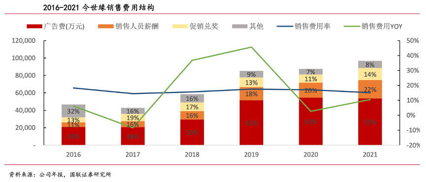 經(jīng)典案例:根據(jù)公司年報、國聯(lián)證券研究所等綜合資訊表明,近五年,今世緣公司銷售 費用逐年提升,費用率保持在 14%-18%之間;從費用明細(xì)看,廣告費從 16 年的 2.09 億元增長至 21 年的 5.37 億元,占銷售費用比例過半。廣告費用持續(xù)投放的背后是公 司對品牌建設(shè)的重視,今世緣構(gòu)建的“國家平臺+高速高鐵+公關(guān)事件+新媒體”傳播 矩陣在建立品牌形象、占領(lǐng)消費者心智、提升產(chǎn)品消費熱度上起到重要作用。