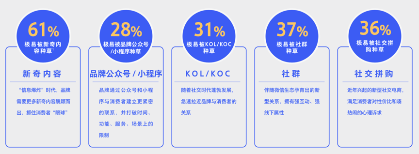 據(jù)騰訊、BCG《2020中國社交零售白皮書》調(diào)查數(shù)據(jù)表明,社交新零售有五大觸點,其中61%的用戶會極容易被新奇內(nèi)容所吸引,28%的用戶會被品牌公眾號/小程序的文章種草,31%的用戶極容易被KOL/KOC所種草,37%的用戶會被社群所種草,而36%的用戶會被社交拼購活動所影響。
