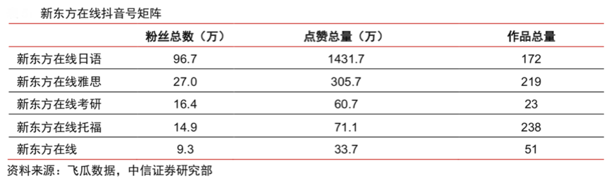 經(jīng)典案例:根據(jù)飛瓜數(shù)據(jù)、中信證券研究部等綜合資訊表明,新東方在線抖音樂(lè)號(hào)矩陣基本構(gòu)建完成,目前新東方在線的官方抖音賬號(hào)主要有 5 個(gè),分別是新東方在線日語(yǔ)、新東方在線雅思、新東方在線考研、新東方在線托福、新東方在線,并沒(méi)有設(shè)置單獨(dú)的 K12 雙師課程的抖音賬號(hào),“年輕品牌溝通特色”突出,大量的品牌價(jià)值有特色、有個(gè)性,更具有產(chǎn)業(yè)型品牌的經(jīng)典優(yōu)勢(shì)。