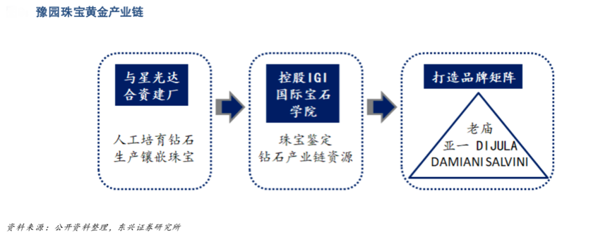 經(jīng)典案例:根據(jù)公開資訊、東興證券研究所等綜合資訊表明,豫園收購 IGI 國際寶石學(xué)院幫助公司實現(xiàn)戰(zhàn)略布局“全球鉆石產(chǎn)業(yè)鏈”,使得公司能更好地獲得鉆石領(lǐng)域?qū)I(yè)知識及行業(yè)資源的同時將產(chǎn)業(yè)鏈進一步向非黃金業(yè)延伸。與星光達的合作幫助公司打通上游,加強珠寶鑲嵌制造端優(yōu)勢,以便更進一步開拓市場。