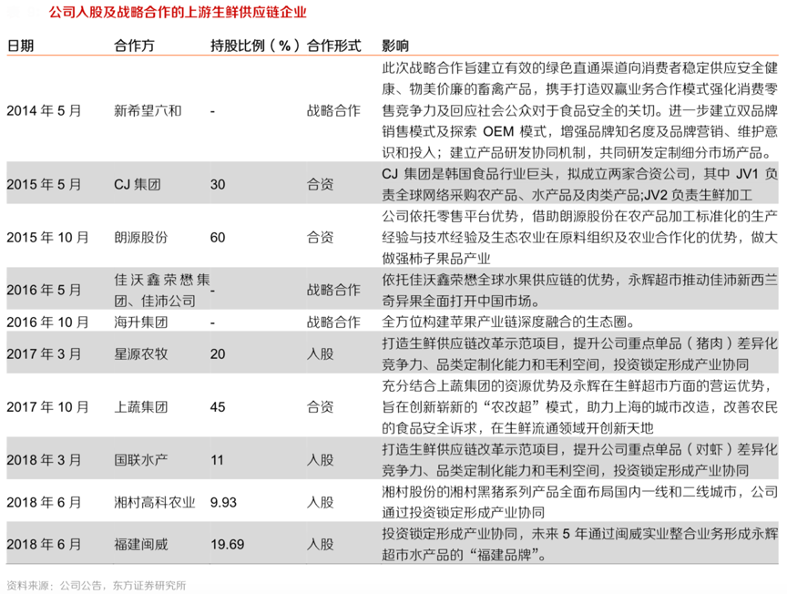 經典案例:根據公司公告、東方證券研究所等綜合資訊表明,2014 年至今,永輝超市先后與新希望六和、 上蔬集團、星源農牧、福建閩威等公司達成戰(zhàn)略合作,對于其他部分規(guī)模相對較小的上游基地也是采取入股的策略,對于產品的生產、檢測、監(jiān)督能很好的管理。2019 年 H1,其農產品檢測總批次達 46.5 萬次, 同比增長 55%;檢測標準更嚴格,檢測準確度更高,蔬菜、水果檢測合格率達 98.76%。