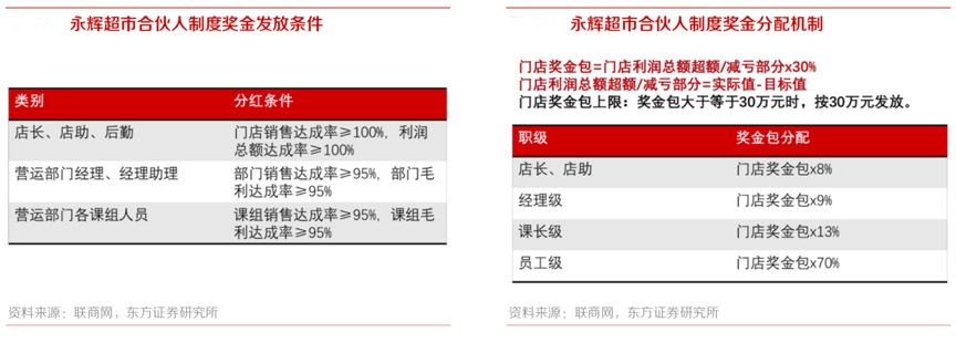 經典案例:根據聯商網、東方證券研究所等綜合資訊表明,永輝超市人力資源部門 2013 年上半年在福建、重慶兩大區(qū)域成功試點門店合伙人項目,并于2013 年 7 月開始在全國所有區(qū)域推行該項目。在此合伙人制度下,公司一線員工在所屬部門達到特定分紅條件后就可以分享超額獎金。