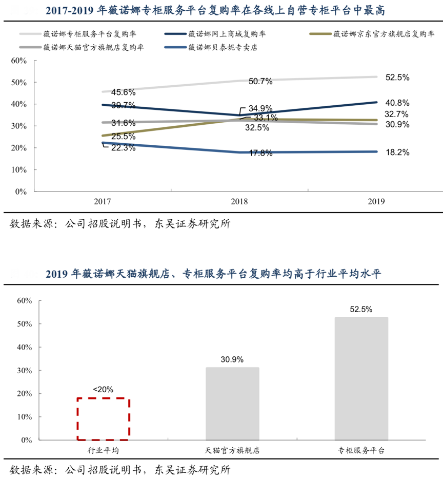 經(jīng)典案例:根據(jù)公司招股說(shuō)明書、東吳證券研究所等綜合資訊表明,2019年薇諾娜公司專柜服務(wù)平臺(tái)的復(fù)購(gòu)率為52.5%,天貓旗艦店/京東旗艦店/官網(wǎng)/貝泰妮專賣店的復(fù)購(gòu)率分別為 30.9%/32.7%/40.8%/18.2%。其私域流量的“專柜服務(wù)平臺(tái)”之所以能夠?qū)崿F(xiàn)較高復(fù)購(gòu)率,主要系公司線下直接觸達(dá)消費(fèi)者并提供服務(wù)的模式帶來(lái)較好體驗(yàn),以及以微信為載體的線上平臺(tái)社交屬性較強(qiáng),增強(qiáng)客戶粘性。