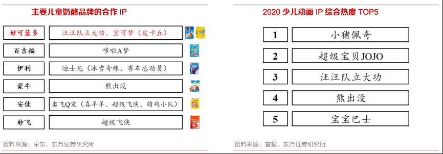 經(jīng)典案例:根據(jù)京東、雷報(bào)、東方證券研究所等綜合資訊表明,妙可藍(lán)多兒童奶酪產(chǎn)品自 2018 年起與知名少兒動(dòng)畫 IP“汪汪隊(duì)”深度合作,通過產(chǎn)品包 裝吸引目標(biāo)人群,百吉福、伊利等品牌則分別攜手哆啦 A 夢(mèng)、迪士尼等動(dòng)畫 IP。雷報(bào)統(tǒng)計(jì)顯示,綜合優(yōu)酷、愛奇藝、騰訊、芒果 TV 四大平臺(tái)數(shù)據(jù)來看,2020 年《汪汪隊(duì)立大功》在少兒動(dòng)畫 IP 熱度中排名第三,在眾多奶酪品牌聯(lián)合動(dòng)畫 IP 中脫穎而出。此外,2020年其與寶可夢(mèng)合作推出金裝奶酪棒,定位目標(biāo)人群父母進(jìn)行“家庭化”營(yíng)銷。