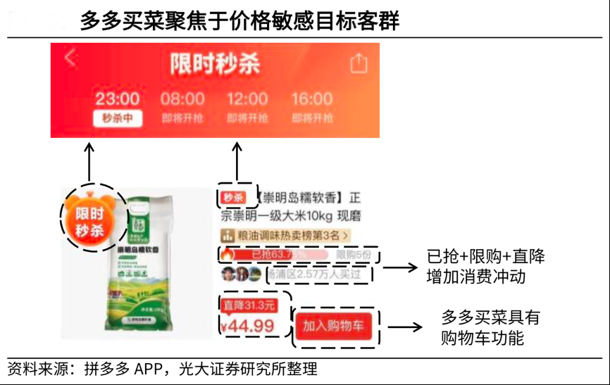 經(jīng)典案例:根據(jù)拼多多APP、光大證券研究所等綜合資訊表明,多多買菜延續(xù)熟人推薦的營銷模式,設(shè)有小編推薦、熱賣榜單等板塊,其中熱賣榜單除了按產(chǎn)品分類外,還設(shè)有附近鄰居銷量榜、附近鄰居回購榜、附近 500m 熱賣榜等欄目。用戶參考鄰居購買記錄將降低某一社區(qū)周邊 SKU 數(shù),提高單 SKU 銷量,從而在一定程度上降低履約成本。