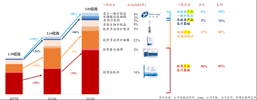 經(jīng)典案例:根據(jù)公司招股說明書、wind、公司官網(wǎng)、公司年報、浙商證券研究所等綜合資訊表明,創(chuàng)爾生物以“創(chuàng)???rdquo;“創(chuàng)爾美”兩大品牌為核心,深耕于活性膠原及其終端產(chǎn)品的研發(fā)、生產(chǎn)、銷售,已成為國內(nèi)生物醫(yī)用活性膠原材料細分領域的領先企業(yè)。其產(chǎn)品以活性膠原為核心,拓展終端應用。按產(chǎn)品成分是否含有膠原可分為膠原產(chǎn)品(20年收入占比85.5%)和非膠原產(chǎn) 品(20年收入占比14.3%)兩大類,其中膠原產(chǎn)品包括醫(yī)療器械和生物護膚品,非膠原產(chǎn)品主要包括醫(yī)療器械和一般護膚品。