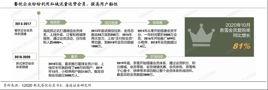 經(jīng)典案例:根據(jù)《2020新式茶飲白皮書》、海通證券研究所等綜合資訊表明,越來(lái)越多的新式茶飲企業(yè)、餐飲企業(yè)通過(guò)小程序、APP、天貓、微商城、社群、官方媒體矩陣等流量入口構(gòu)建品牌流量池,打造高效的線上營(yíng)銷工具,提供更多功能如預(yù)點(diǎn)單、積分換禮品、專屬評(píng)價(jià)渠道,更好匯聚消費(fèi)者數(shù)據(jù)及意見(jiàn)。