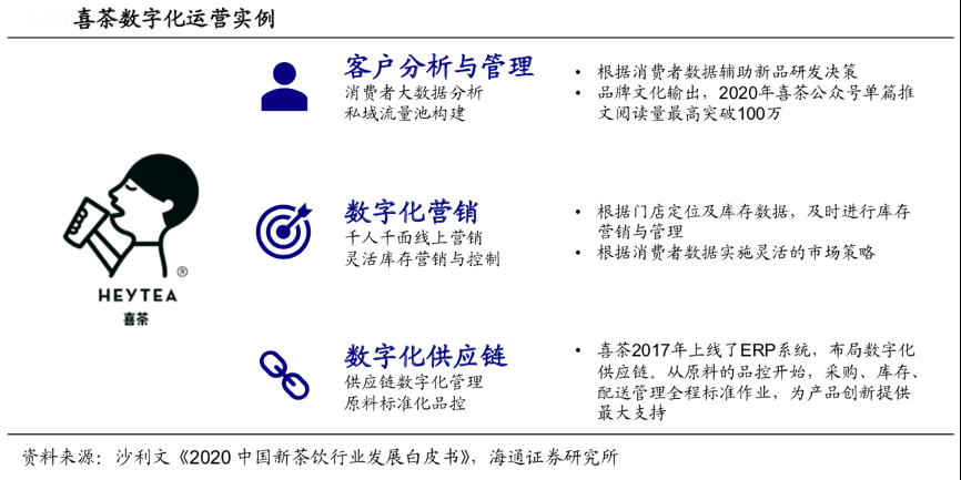經(jīng)典案例:根據(jù)沙利文《2020 中國(guó)新茶飲行業(yè)發(fā)展白皮書》、海通證券研究所等綜合資訊表明,除了喜茶 GO 小程序,喜茶在數(shù)字化運(yùn)營(yíng)上也進(jìn)行了更多的探索,其根據(jù)門店定位及庫(kù)存數(shù)據(jù),及時(shí)進(jìn)行庫(kù)存營(yíng)銷與管理,并根據(jù)消費(fèi)者數(shù)據(jù)實(shí)施靈活的市場(chǎng)策略;2017年喜茶上線 ERP 系統(tǒng),布局?jǐn)?shù)字化供應(yīng)鏈。從原料的品控開始,采購(gòu)、庫(kù)存、配 送管理全程標(biāo)準(zhǔn)作業(yè),為產(chǎn)品創(chuàng)新提供最大支持。
