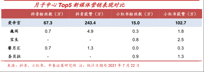經(jīng)典案例:根據(jù)抖音、小紅書、中泰證券研究所等綜合資訊表明,愛帝宮創(chuàng)新廣告營銷、明星營銷、新媒體營銷等,以抖音平臺為例,愛帝宮官方賬號分享大量科學(xué)育兒知識、新生兒和產(chǎn)褥期護(hù)理經(jīng)驗、客戶入住體驗分享等大量原創(chuàng)視頻內(nèi)容,截至 2021 年 7 月,積累粉絲數(shù)達(dá) 67.3 萬,獲點(diǎn)贊數(shù)累計 243.5 萬。