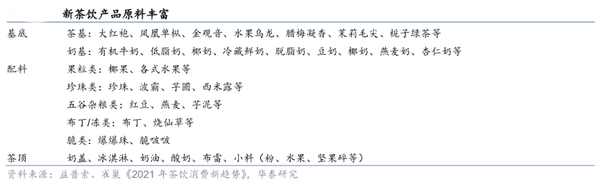 經(jīng)典案例:根據(jù)益普索雀巢《2021年茶飲消費(fèi)新趨勢》、華泰研究等綜合資訊表明,新茶飲產(chǎn)品構(gòu)成大致可分為三個(gè)層次,分別是基底(包括茶基/奶基)、配料(包括果粒類、珍珠類、五谷雜糧類、布丁/凍類、脆類)、茶頂(包括奶蓋、冰淇淋、酸奶、奶油以及各式的頂部小料如粉類、水果類、顆粒類)?;趯?duì)消費(fèi)者洞察,新茶飲品牌通過對(duì)產(chǎn)品結(jié)構(gòu)的有機(jī)組合,不斷推出新產(chǎn)品滿足消費(fèi)者日漸多元的需求,此外消費(fèi)者還可根據(jù)自身喜好進(jìn)行產(chǎn)品選擇甜度、溫度、是否分裝等。目前新式茶飲共包括純茶、奶茶、水果茶、奶蓋茶、水果奶茶、氣泡茶等。