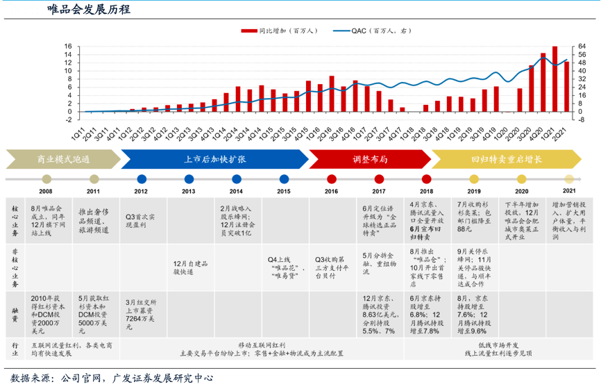 經(jīng)典案例:根據(jù)公司財報、廣發(fā)證券發(fā)展研究中心等綜合資訊表明,唯品會發(fā)展大致可以分為四個階段:品牌特賣模式逐漸跑通→上市后加快擴張→調(diào) 整精簡布局→回歸特賣用戶重啟增長;在不斷的探索調(diào)整中,唯品會提煉出“品牌 特賣”的核心能力。