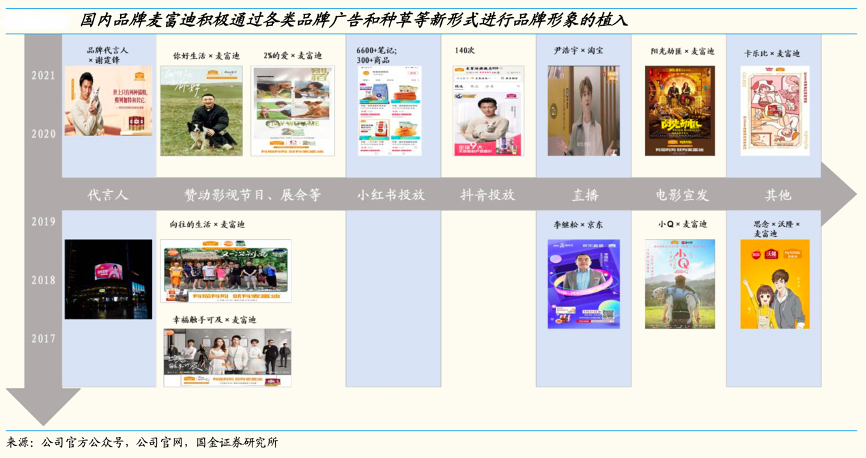 經(jīng)典案例:根據(jù)公司官方公眾號、公司官網(wǎng)和國金證券研究所等綜合資訊表明,相較于海外進(jìn)口品牌采用代理商模式進(jìn)行管理,國內(nèi)企業(yè)對于消費(fèi)者需求變化感知、品牌推廣宣傳方面更加敏銳,其品牌構(gòu)建方面的戰(zhàn)略思維也較一般海外進(jìn)口品牌更加長遠(yuǎn),因此投入了更多品牌營銷資源和新興渠道資源。例如,麥富迪積極通過傳統(tǒng)品牌廣告 投放、以及抖音、直播、小紅書等新型品牌營銷相結(jié)合的方式,從長期構(gòu)建品牌形象。