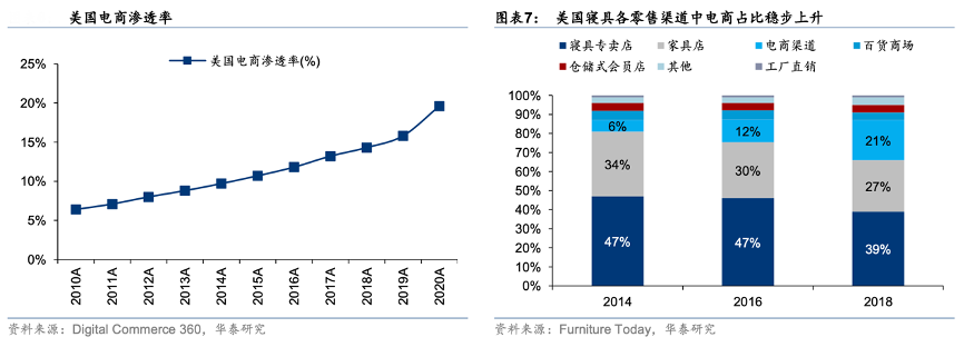 經(jīng)典案例:根據(jù)Digital Commerce 360、Furniture Today、華泰研究等綜合資訊表明,在電商平臺(tái)崛起、消費(fèi)者消費(fèi)習(xí)慣改變、物流條件改善、床墊廠商推動(dòng)產(chǎn)品及服務(wù)創(chuàng)新等因素共同推動(dòng)下,近年來(lái)美國(guó)床墊消費(fèi)線上渠道占比快速提升,據(jù) Furniture Today 數(shù)據(jù),2018年電商渠道收入占到美國(guó)寢具零售渠道的 21%,較 2016 年上升9pct。根據(jù) Statista 統(tǒng)計(jì),2021年美國(guó)床墊線上銷(xiāo)售比例預(yù)計(jì)達(dá)27%。