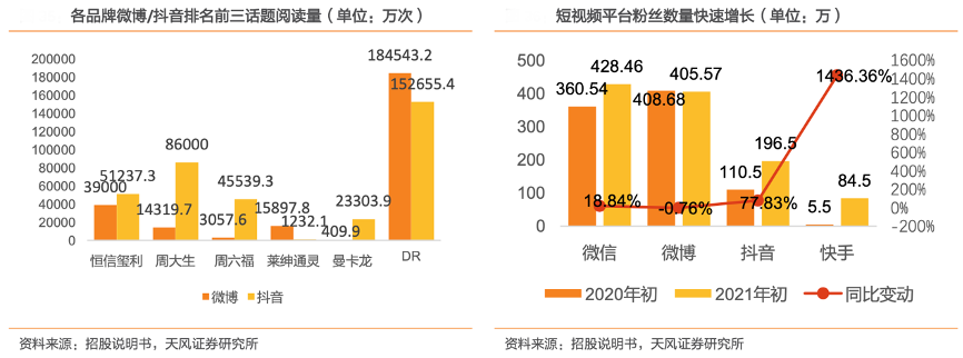 經(jīng)典案例:根據(jù)招股說明書、天風(fēng)證券研究所等綜合資訊表明,截至目前,DR 已在微博、微信、抖音、快手、小紅書等知名互聯(lián)網(wǎng)平臺擁有超過2000萬粉絲,在社交類和視頻類平臺的粉絲數(shù)量均領(lǐng)先于同行業(yè)可比公司。以微博舉例,截止 2021 年 10 月 7 日,DR 相關(guān)熱門話題如“#dr#”、“#我是 dr 族#”、“#dr 鉆戒#”、“#亞洲 dr 男神評選#”、“#Yes to DR#” 等有近 20 億次的閱讀以及約 48 萬次的討論,在以上話題中,DR 通過情感話題、“男神評選”等制造熱點,吸引流量,從而與大批消費者或潛在消費者之間形成良好的互動關(guān)系。