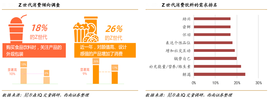經典案例:根據尼爾森IQ定量調研、西南證券等綜合資訊表明,Z世代喜歡探索新奇消費,具有高量、高額、高頻次購買食品飲料的特點。在選購食品飲料產品時,Z 世代比非 Z 世代人群更加關注產品的包裝外觀,在包裝顏值高、設計感強的產品上增加消費的比例更高。除了滿足解渴飽腹等基本功能類需求外,Z 世代對飲料零食具有額外的情感類需求,例如增加社交互動和表達個性品位等。因此,具備高顏值的包裝設計和高流 量的 IP 聯(lián)名及冠名宣傳的產品能夠更快速地搶占飲料市場份額,吸引更多 Z 世代實現自我滿足與社交滿足,在激烈競爭中攫取一席之地。