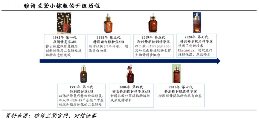 經(jīng)典案例:根據(jù)雅詩(shī)蘭黛官網(wǎng)、財(cái)信證券等綜合資訊表明,從小棕瓶的升級(jí)歷程來(lái)看,小棕瓶的前后七次迭代中經(jīng)歷了五次加法,每 一次加法均添加具有新功效的發(fā)酵原料以不斷完善整體修復(fù)力,與之同時(shí)公司亦會(huì)開(kāi) 創(chuàng)新概念,小棕瓶已從最開(kāi)始的“細(xì)胞修護(hù)”逐步進(jìn)階至“DNA 修護(hù)”、“晝夜節(jié)律同 步修護(hù)”、“細(xì)胞自噬修護(hù)”、“信源技術(shù)修護(hù)”。