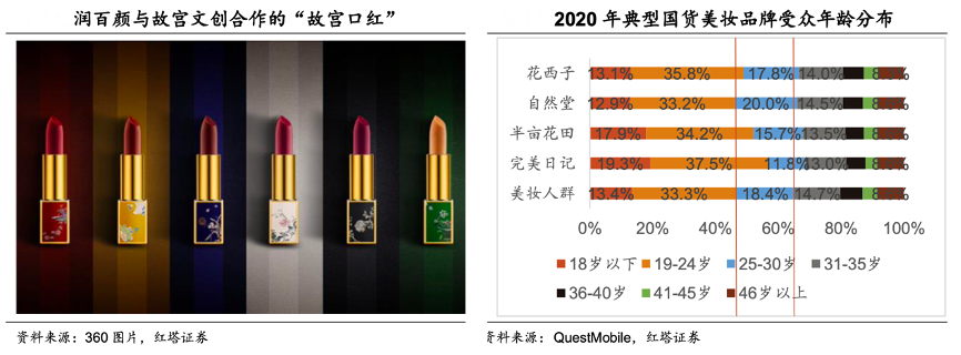 經(jīng)典案例:根據(jù)360圖片、QuestMobbile、紅塔證券等綜合資訊表明,除了出現(xiàn)重新評價國產(chǎn)品牌商品的現(xiàn)象外,消費者審美方面以漢服熱為代表的東方美學同樣滲透到了美妝領域,花西子的“雕花口紅”、潤百顏與故宮文創(chuàng)合作的“故宮口紅”的出圈皆為印證,國產(chǎn)品牌通過俘獲新生代年輕消費者的心智實現(xiàn)品牌突圍。