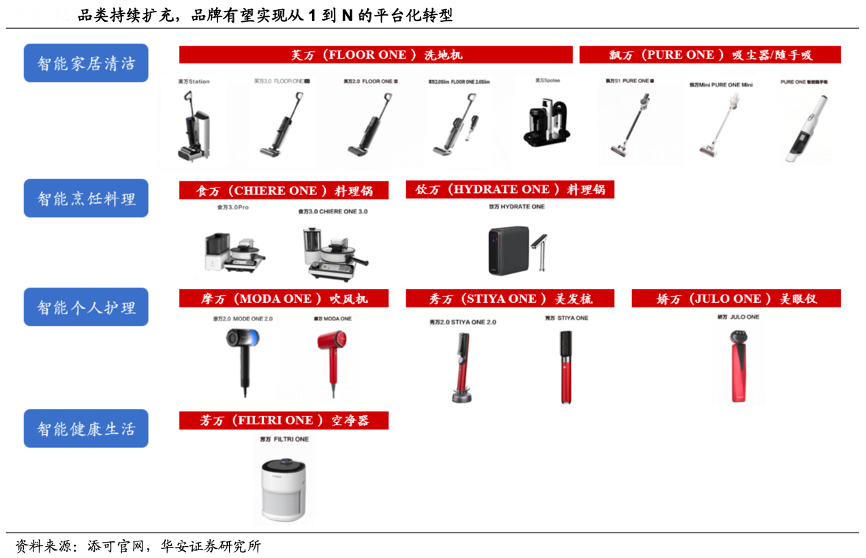 經(jīng)典案例:根據(jù)添可官網(wǎng)、華安證券研究所等綜合資訊表明,添可在洗地機爆款 產(chǎn)品之外,持續(xù)擴充品類矩陣,截至目前,其已在 4 個細分品類方向完成初步布局,即智能家居清潔、智能烹飪料理、智能個人護理和智能健康生活,實現(xiàn)從單一智能品類向多智能品類的擴展,并通過物聯(lián)網(wǎng)技術(shù)在多品類基礎(chǔ)上構(gòu)建用戶生態(tài)。